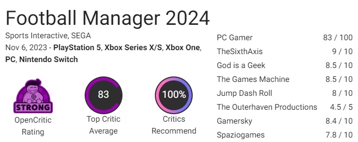 Football Manager 2024 ostentava uma classificação geral de 83 no momento em que este artigo foi escrito, tornando-o um dos jogos Game Pass do primeiro dia com melhor classificação durante todo o ano.