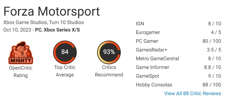 O novo jogo tem atualmente uma avaliação geral da crítica de 84, tornando-o um dos novos lançamentos de videogame com maior audiência de 2023 até agora. Mas mesmo que o novo Forza Motorsport seja um dos jogos mais bem avaliados de 2023, na verdade está no limite inferior de um jogo Forza Motorsport.